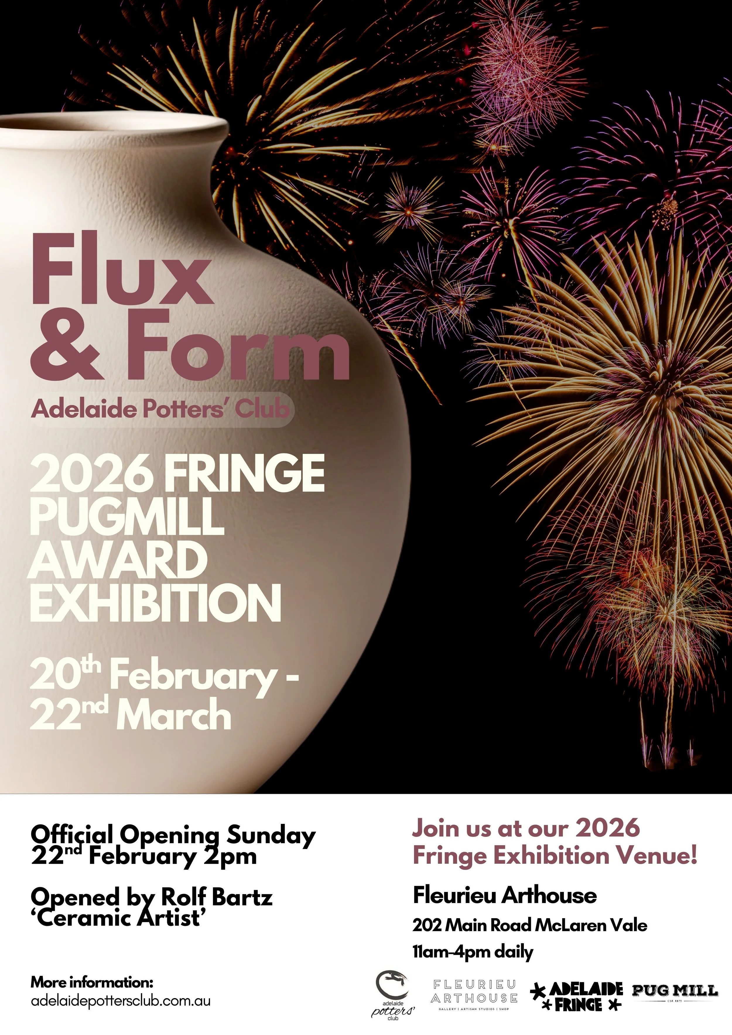 The Adelaide Potters’ Club Fringe Pugmill Award 2026 title is ‘Flux and Form’.